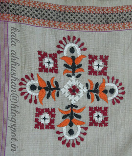 Kutchwork or Kutchi bharat as it is called in Gujarati comes from the Western region of India . Also known as Sindhi stitch , this beautiful technique is geometric in form . The stitches are worked by laying a foundation framework of herringbone stitch or cretan stitch. In the second part , this framework is filled with interlacing to completely fill the framed area . And combination of perfect framework and interlacing only , can produce the perfect motif.